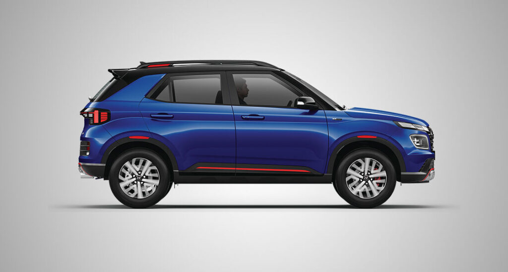 Venue N Line वर्जन में स्पोर्टी टच जोड़ा गया है — इसमें रेड एक्सेंट्स, डुअल एग्जॉस्ट टिप्स, N-बैजिंग और स्पोर्टी बम्पर डिज़ाइन दिया गया है, जिससे यह बाकी वेरिएंट्स से अलग नजर आती है।
